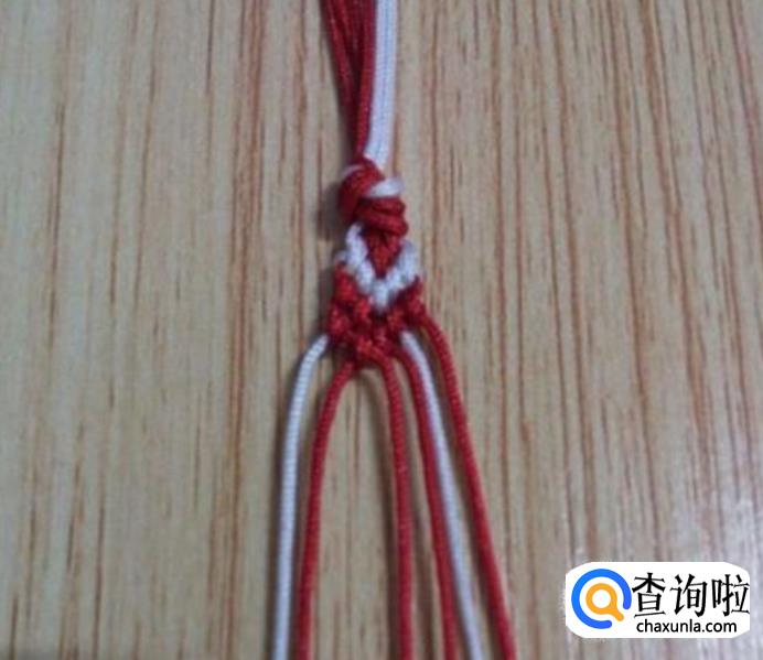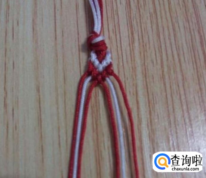 完成第一步骤后,就开始编吧,先编第一排的结,从左边顺数第一根线白线与第二根红线以红线为轴线,轴线不动,白线编斜卷结,中间两根线都为红线,任选其中一根线为轴线编斜卷结。最右边的两根线,同左边一样,以红线为轴,白线编斜卷结,如图所示。