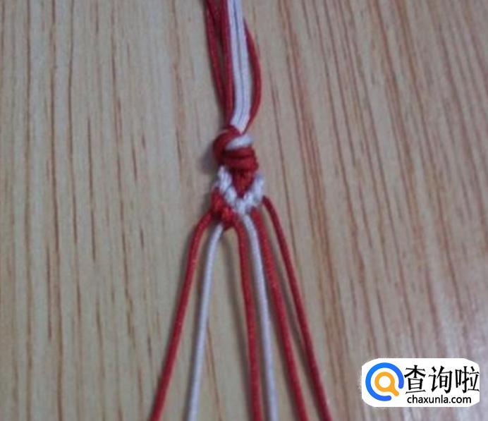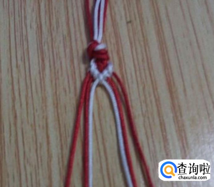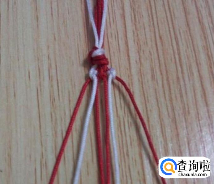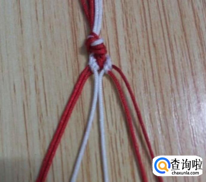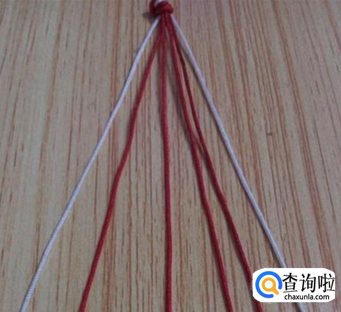 首先准备六根等长的线,共两种颜色,一种颜色四根,另一种颜色二根,我选择的是四根红线,2根白线。准备好后,将六根线合拢打一个活结,如图所示,然后再根据图线的颜色位置进行相对应摆放。注意,线一定要如图摆放,不然花样会走样,还有线的颜色只能两种。