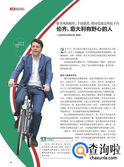 既然是杂志不是人物传记汇总,所以也会紧紧扣住当下的热点话题,比如无意间被记者无意拍到骑自行车上下班而走红的佛罗伦萨市长伦奇就成了当时环球人物中的报道人物。