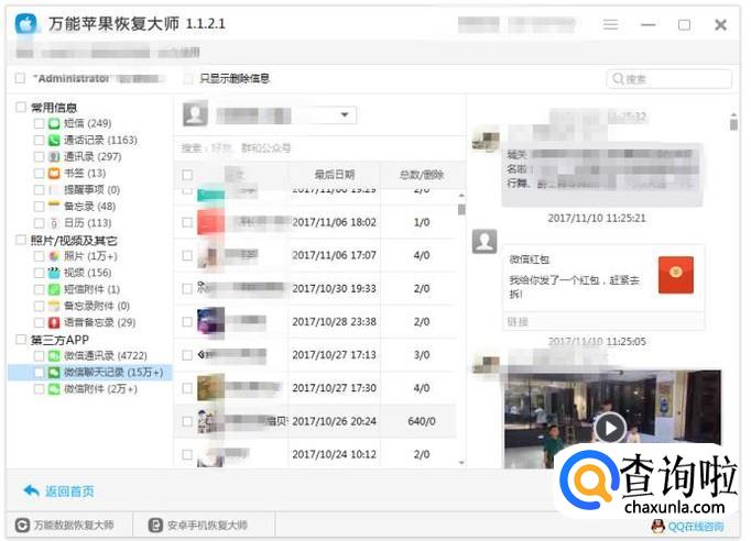点击【聊天记录】,进入修复微信聊天记录,等待数据恢复。