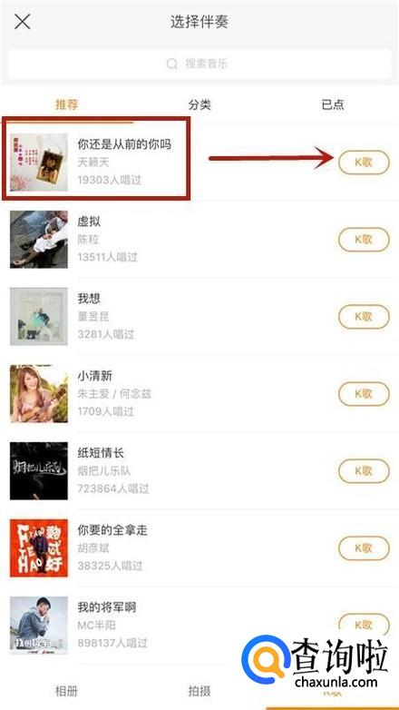 然后选择我们要演唱的歌曲并点击右侧的k歌,如下图所示。