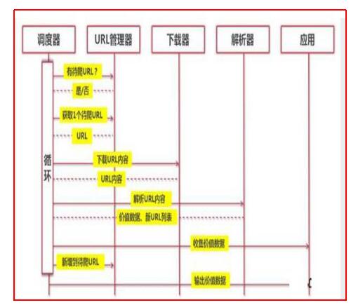 (Python爬虫通过URL管理器,判断是否有待爬URL,如果有待爬URL,通过调度器进行传递给下载器,下载URL内容,并通过调度器传送给解析器,解析URL内容,并将价值数据和新URL列表通过调度器传递给应用程序,并输出价值信息的过程。)