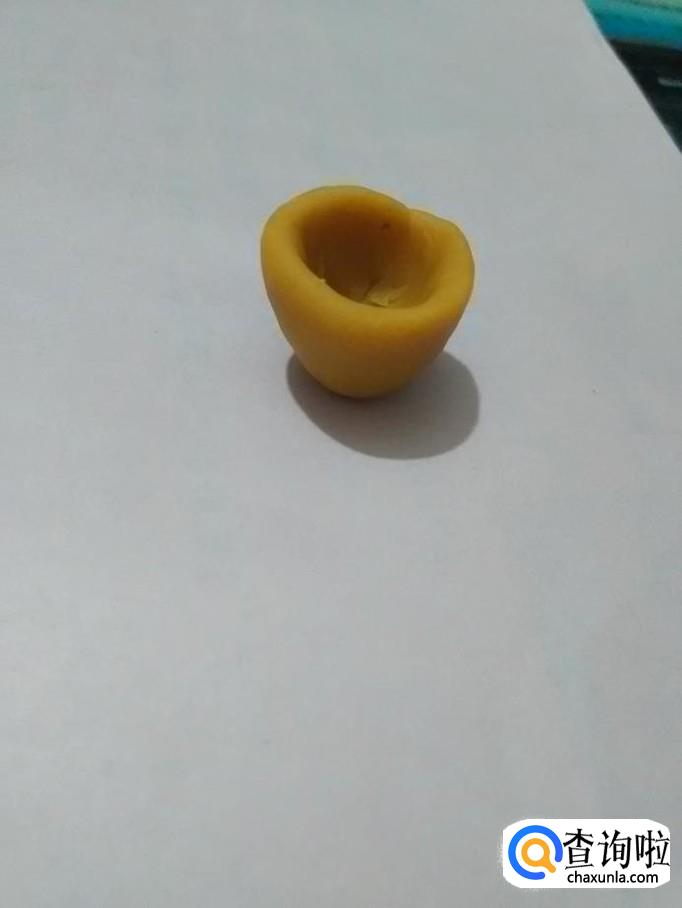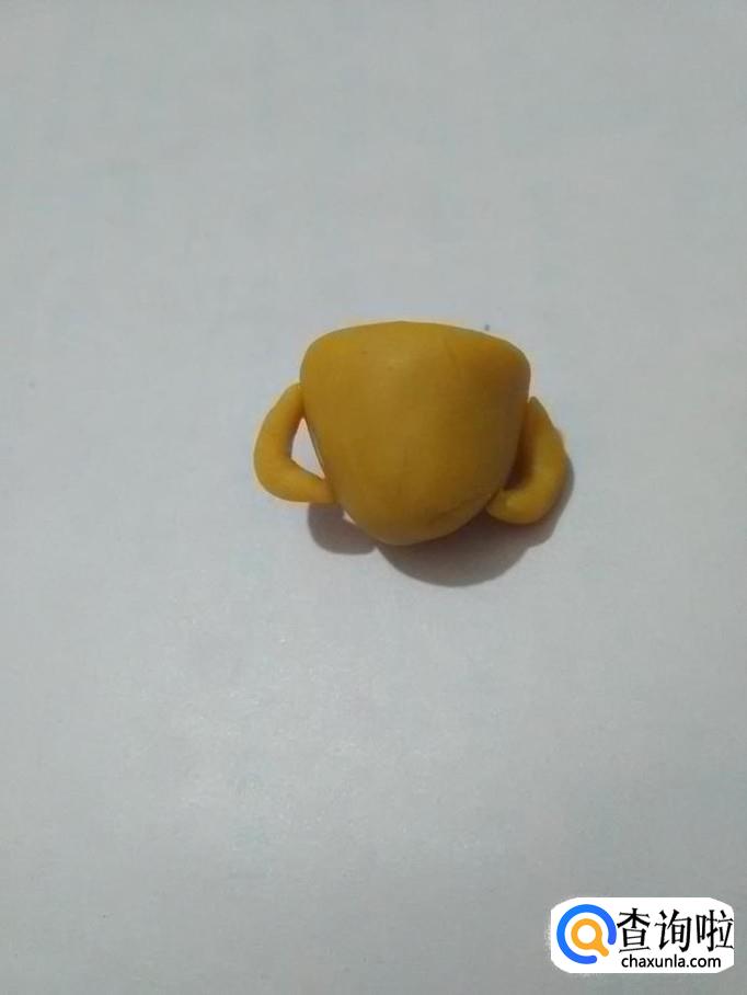 再取一大块橡皮泥,在手心里,用拇指和食指捏成一个小碗状,当作奖杯的杯子。