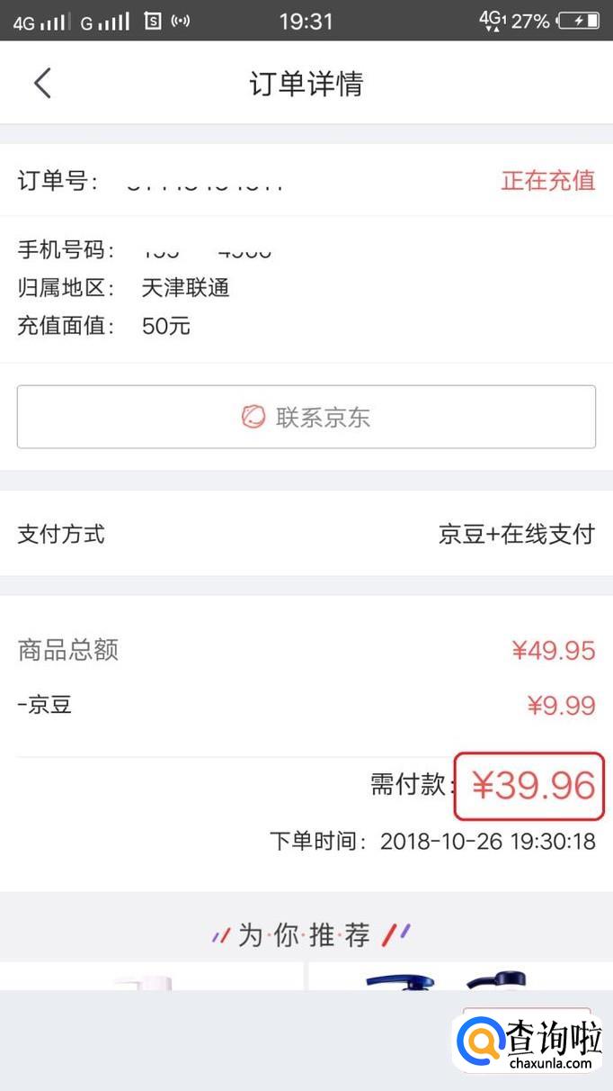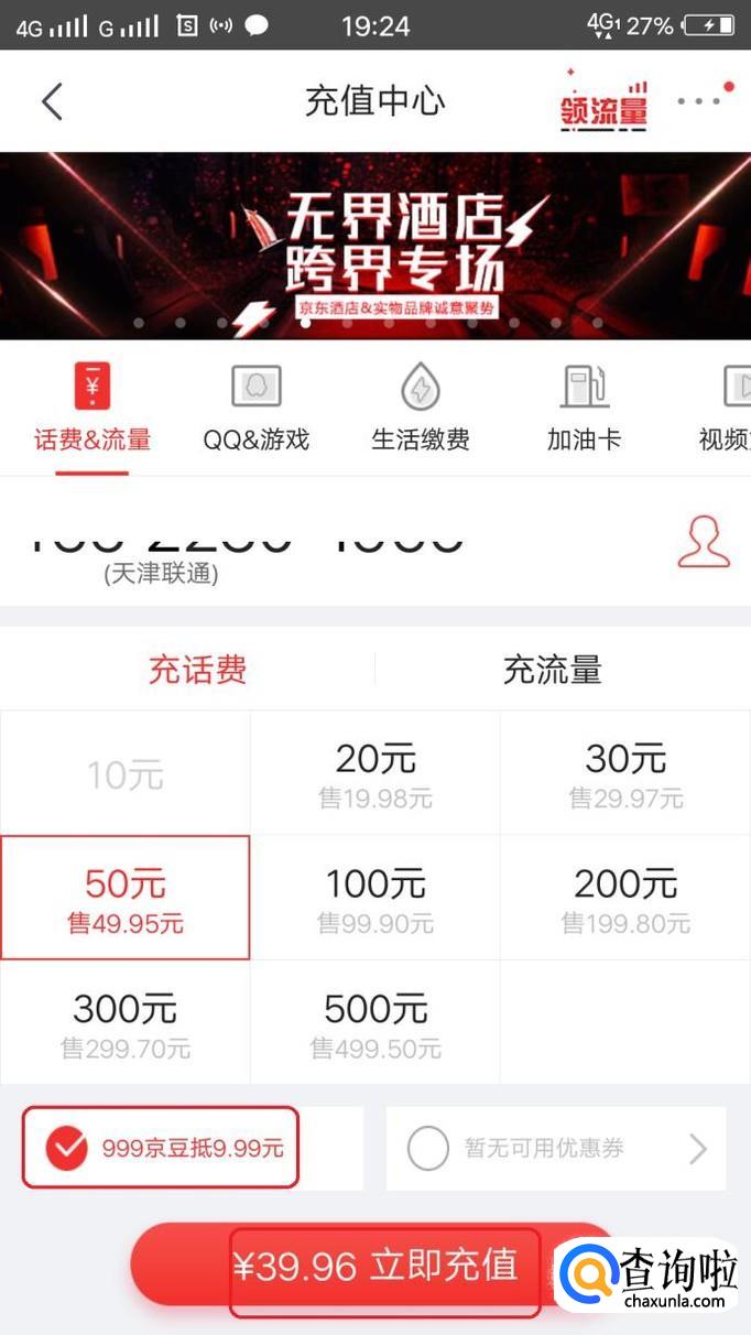 如图所示,我们充话费时,可以用京豆(京东推出的一种虚拟货币)抵扣现金使用,充值50元可以抵扣9.99元,是不是很实惠呢?我经常用这个方法充值。