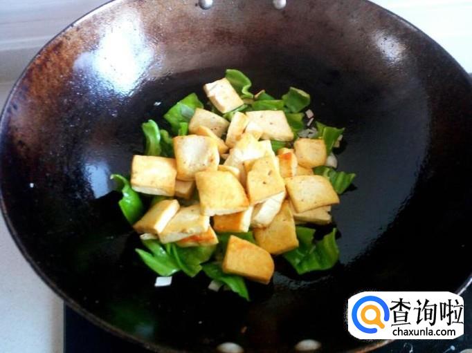 青椒用水洗净,控干水分,切成和豆腐同样大小的块。切好葱,姜,备用。