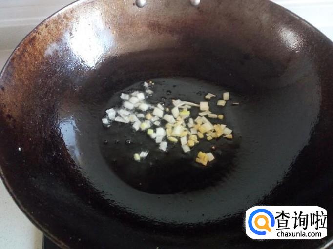 锅内重新放油加热,油热后放入葱,姜爆锅,放入青椒翻炒。