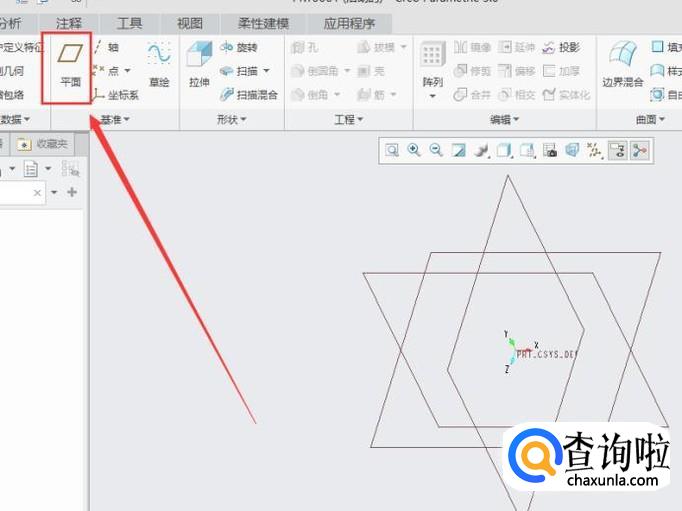 点击模型功能区的平面功能键,创建新的基准平面,如图所示。