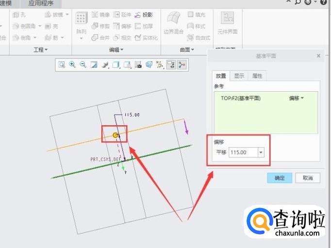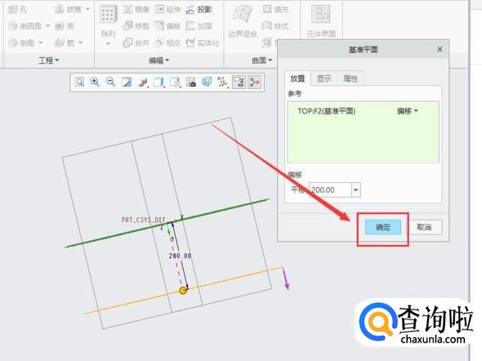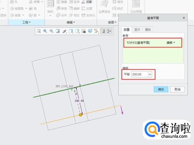 点击确定,即可得到修改后的参考基准平面,这是修改后的基准平面在TOP面的上方,如图所示。