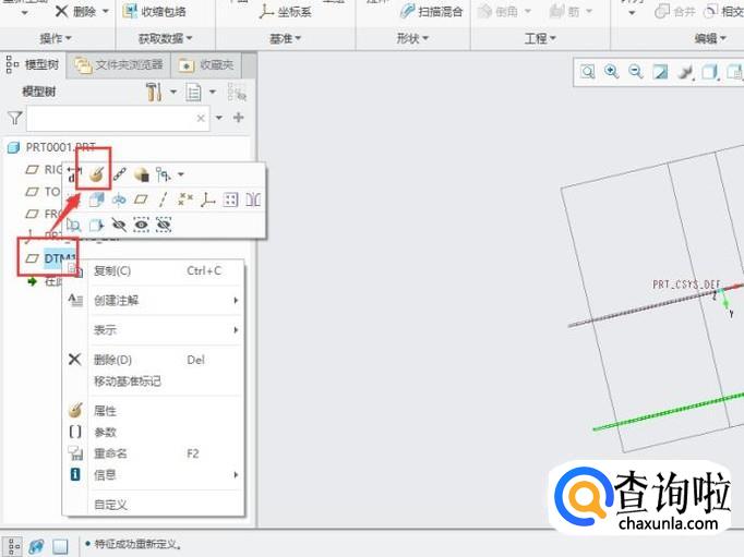 若是更改新创建的基准平面,在左侧的模型树中点击行创建的平面,右击选择编辑定义,如图所示。