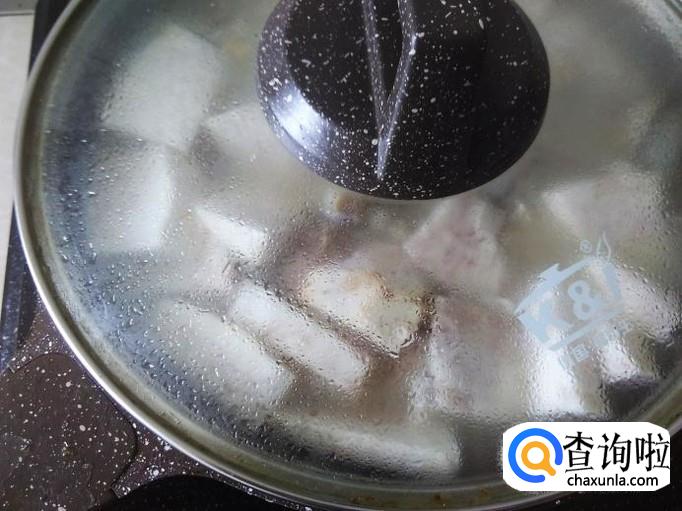 然后打开盖子,汤水变奶白色后加芋头。