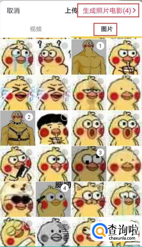 切换到“图片”,点选2张以上图片,选好后点击右上角“生成照片电影”。