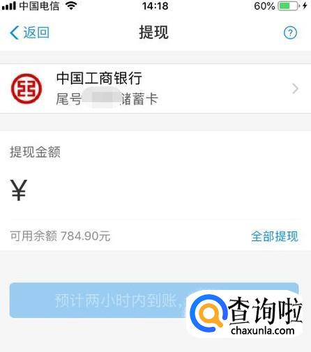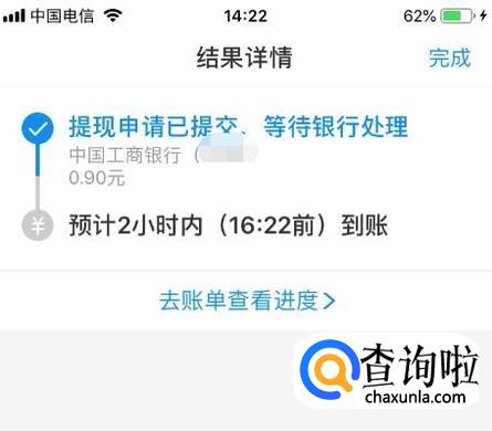 提现成功后,等待银行处理,一般都是秒到账,最迟2小时内,这样你就把支付宝赏金提现了。