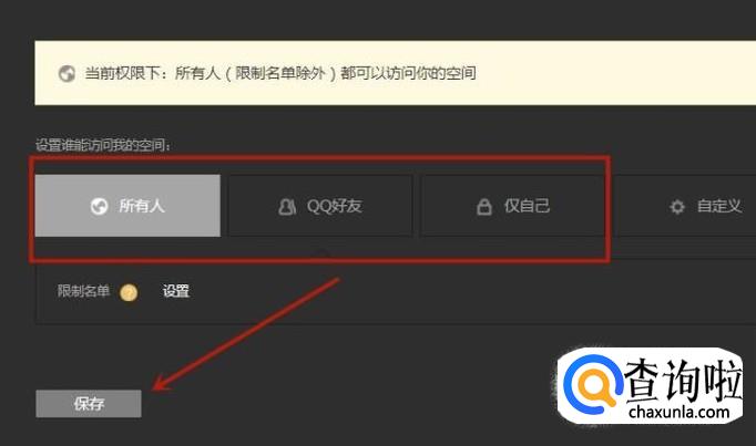然后选择你的空间对谁开放并点击保存,如下图所示。