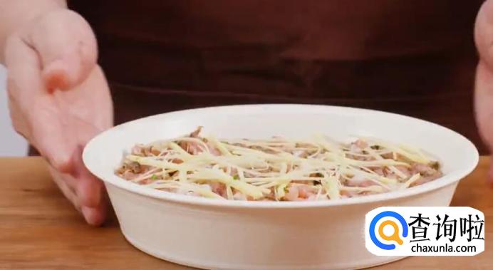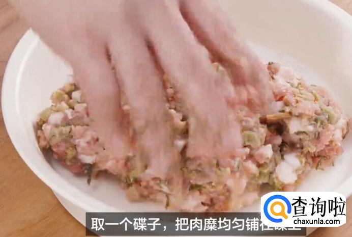 取一个碟子,把肉糜均匀铺在碟子上,并用筷子把肉拨松。