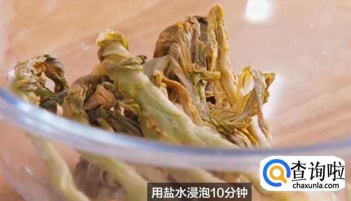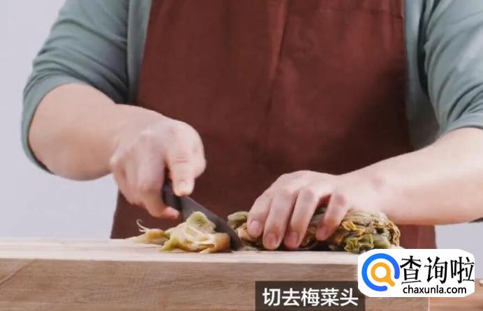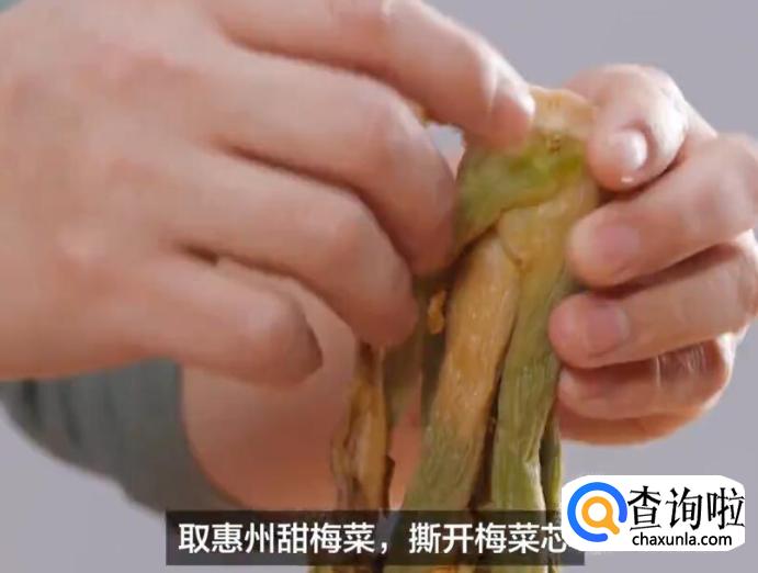 首先需要处理梅菜。取惠州的甜梅菜,撕开梅菜芯。
