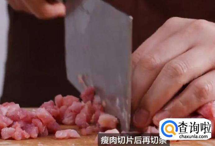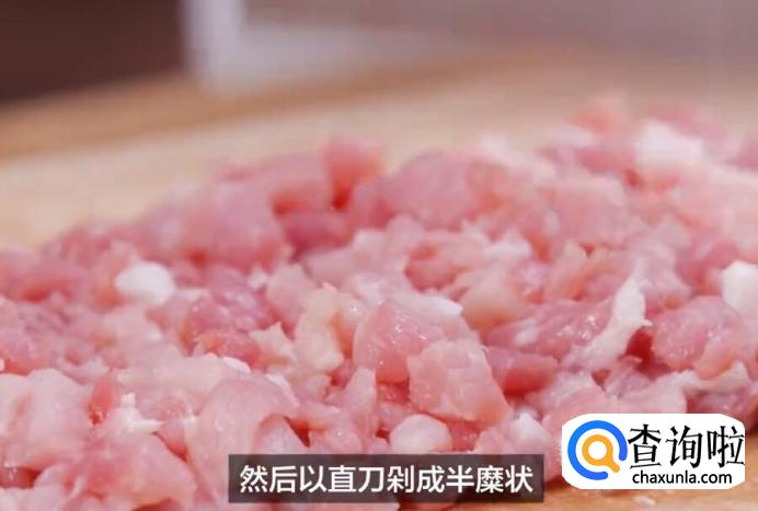 瘦肉切片后,再切条,然后以直刀剁成半糜状。
