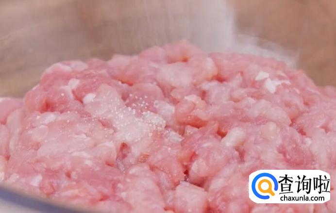 然后在切好的瘦肉中加入少许盐,顺时针搅拌。