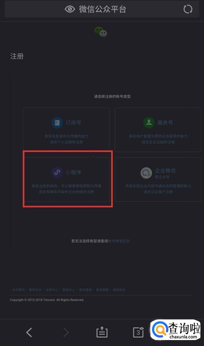 接下来,就进入了微信公账号类型选择页面。选择“小程序”。