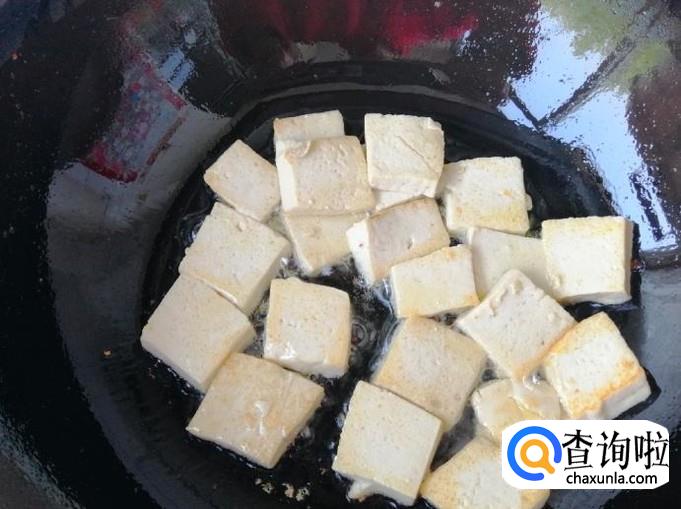 取适量新鲜的豆腐,把豆腐切成如图所示的豆腐块,然后炒锅放油,把豆腐用油煎至金黄,出锅前放入备好的姜末翻炒均匀,姜末豆腐炒好后盛入盘中待用。