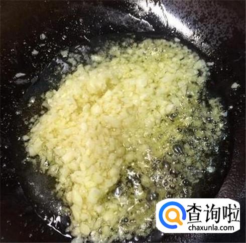 热锅下油,翻入蒜蓉煸出香味。