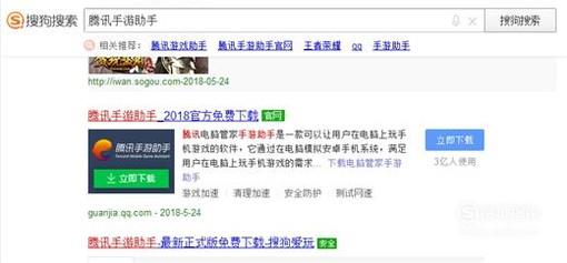首先,我们使用搜狗搜索“腾讯手游助手”,然后选择第一个搜索结果点击进入腾讯手游助手官网首页。