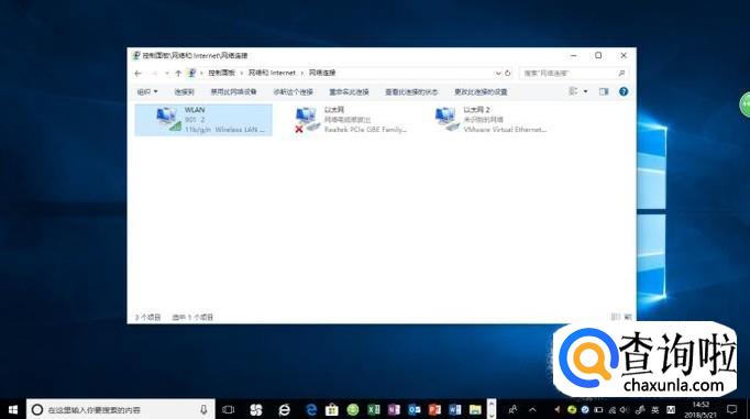 弹出"网络连接"对话框,如图所示。鼠标右击"WLAN"图标,弹出快捷菜单选择"属性"项。