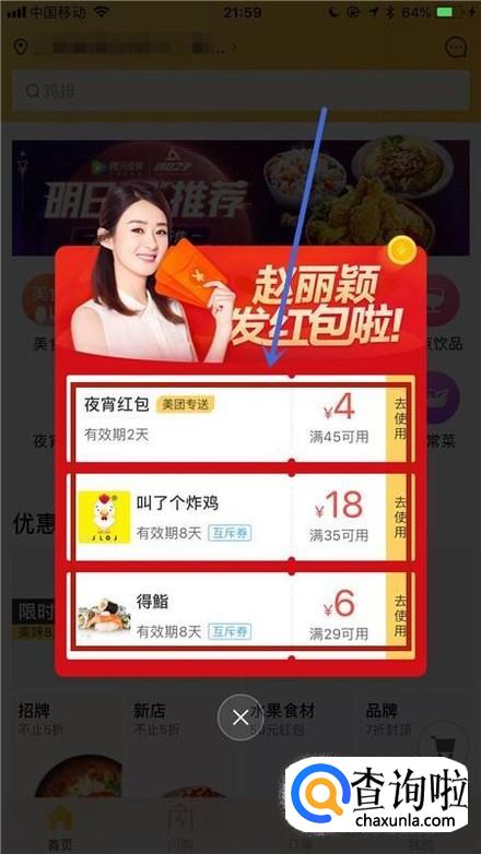 进入app以后你可以领取到一些优惠券,这些优惠券是可以在购买食物的时候,是可以节约你的购买成本的。