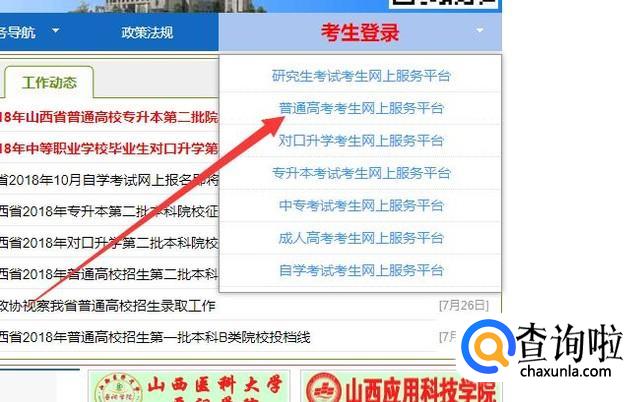进入之后,将鼠标放在“考生登录”上面,然后选择“普通高考考生网上服务平台”,如图所示。