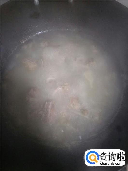 往锅中倒入清水,将水烧开后倒入洗干净的排骨,盖上锅盖,继续烹煮,直到再次将水煮开,将排骨捞起备用。