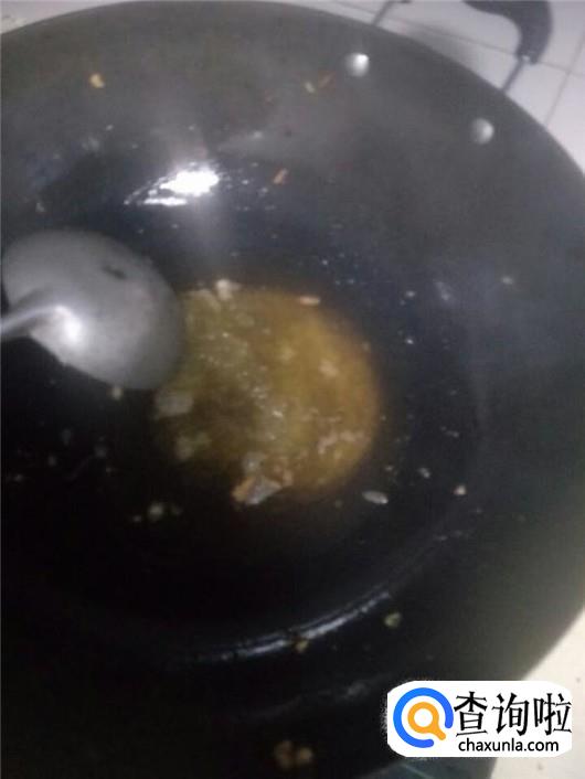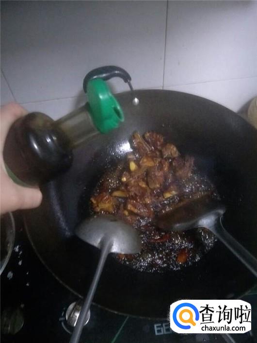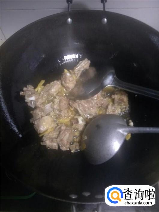 锅中倒入菜油将其烧热,然后倒入排骨姜片和大蒜,不断翻炒,等到排骨煎炸至表面金黄后捞出放在一旁备用。
