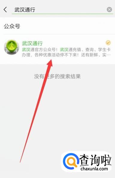 进入之后,搜索“武汉通行”,点击进入并关注该公众号,如图所示。