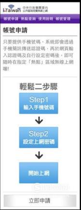 网络。iTaiwan免费wifi服务。为提升为民服务品质及满足民众外出活动的连网需求,iTaiwan爱台湾免费无线上网服务,已于全台各地旅游景点、交通运输节点、文教馆所、申办洽公场所等公共空间,设立约4,400个WiFi热点,可提供民众免费无线上网基本信息服务。申请方式:大陆游客入境后,可以到全台各地旅服中心服务台凭护照申请iTaiwan账号。账号开通后,只要在全台iTaiwan无线上网热点,使用支持WiFi的智能型手机、笔记本、平板计算机等行动工具,选择WiFi网络名称为“iTaiwan”的服务识别名称,输入账号与密码登入后,便能使用iTaiwan WiFi无线上网,查询观光旅游信息及与亲朋好友实时通讯。