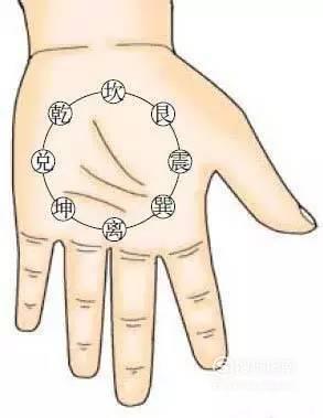 位置:在手掌面,以手心为圆心,以圆心至中指指根横纹约2/3处为半径作圆周,八卦即在此圆圈上,分别是乾、坎、艮、震、巽、离、坤、兑八个卦区。