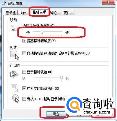出现鼠标属性面板后,我们点击“指针选项”标签,然后,我们可以通过移动滑块,调节指针移动速度,如果鼠标不够灵敏,我们把移动速度调快,点击应用和确定就好了。