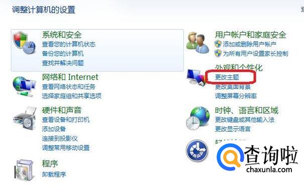 在控制面板中找到外观和个性化下的“更改主题”,点击进入。