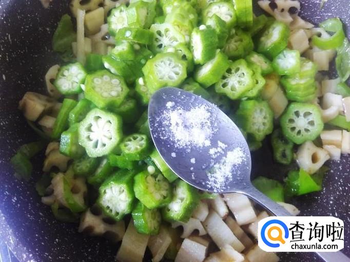 莲藕100克,秋葵150克,青椒20克,蒜米适量,自做的酸梅紫苏辣椒酱1勺,生抽1勺。