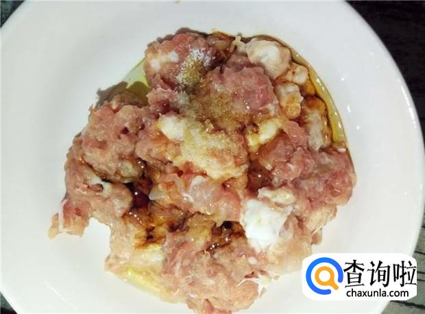 搅碎好的肉沫加入适量的花生油、酱油、盐,腌制一会,腌制的过程中,可以把肉沫放冰箱冻一会,这样肉沫变得更加黏糊。