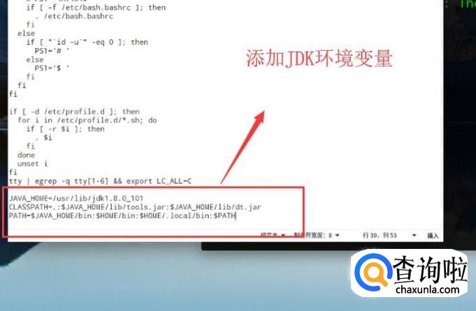 然后在环境变量文件的末尾添加JDK的安装路径到PATH变量中,如下图所示