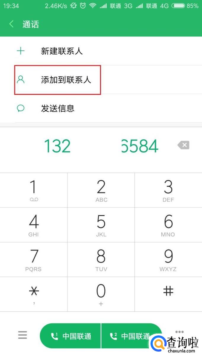 输入手机号码完毕之后,点击页面顶部的“添加到联系人”菜单选项。