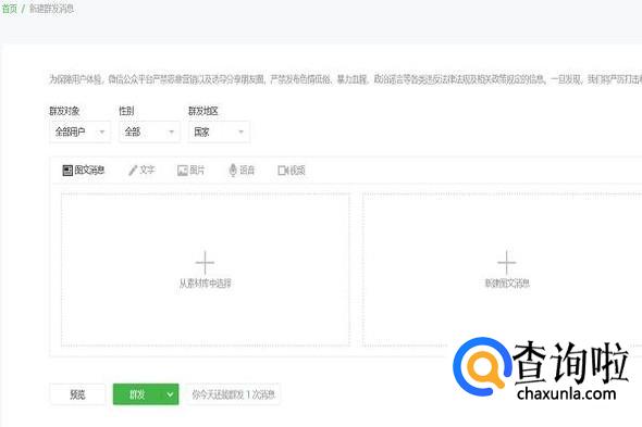 点击新建群发后,就进入了这个页面,就可以编辑图片和文字了。图片的编辑需要先上传,还要控制图片的大小。