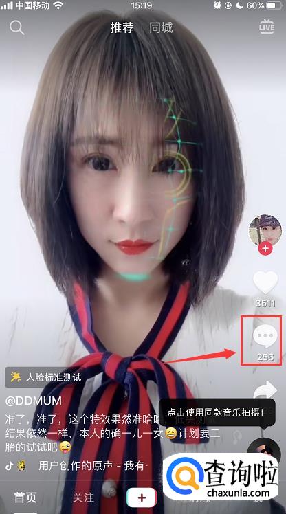 打开抖音app,任意选择一个视频,点击进入播放页面,在播放页面右侧找到评论按钮,点击一下。