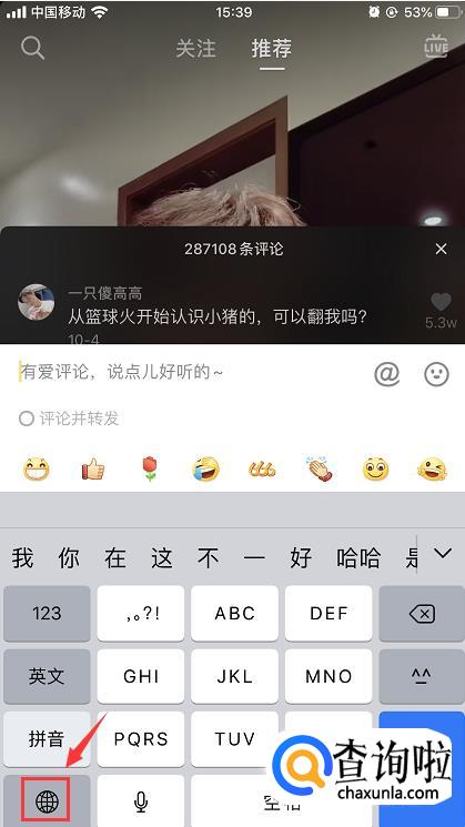 如果你不想用抖音系统自带的表情图片,那么可以用输入法的表情包。比如苹果手机键盘自带有emoji表情,点击下图的图标,将表情面板调出来。