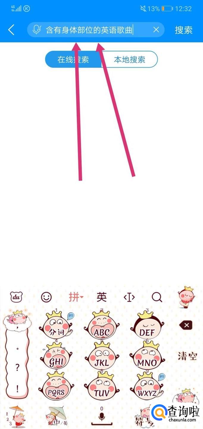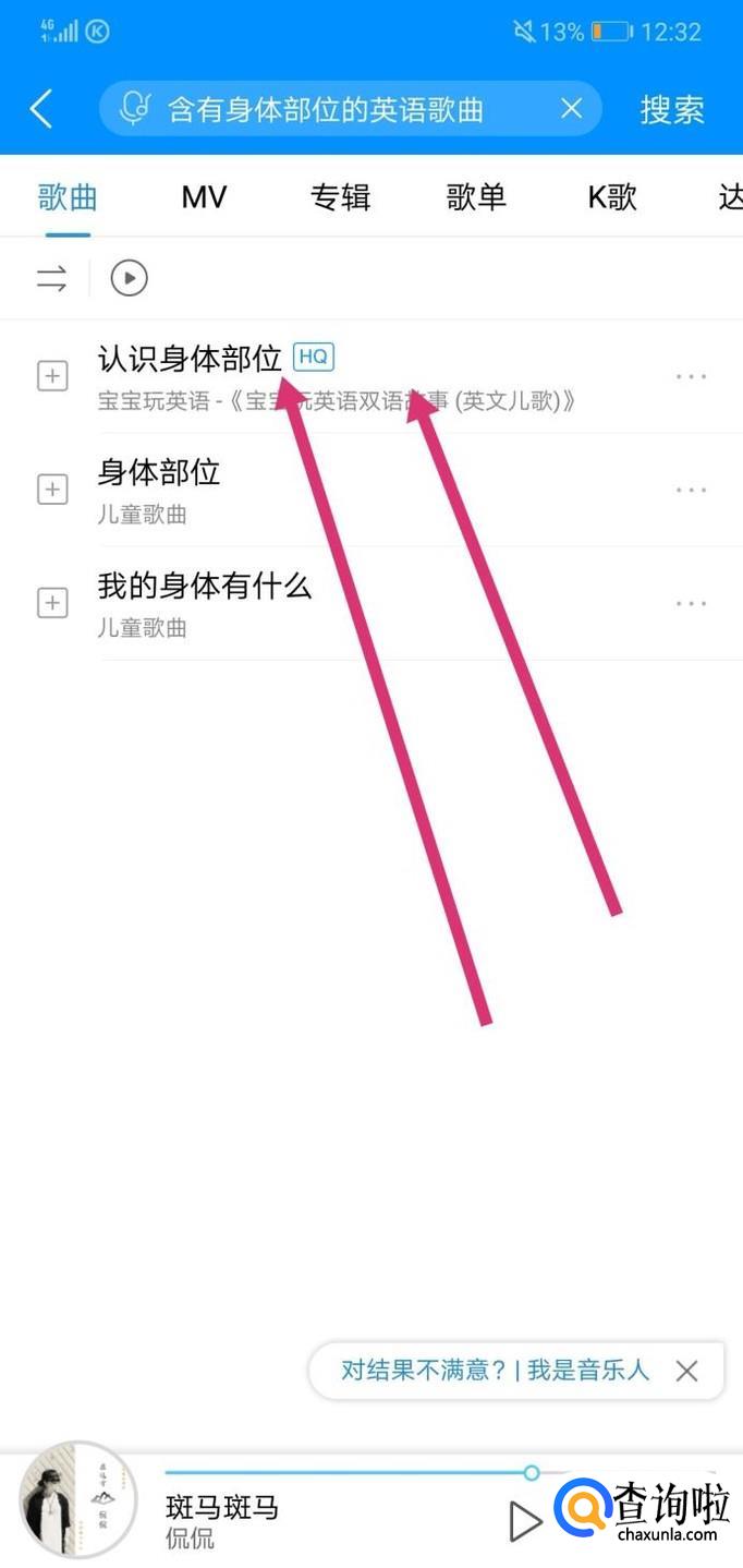 然后,我们进入音乐主页,点击搜索相关歌曲,这个时候你可以打去相关的关键词,比如身体部位、英文歌曲等。