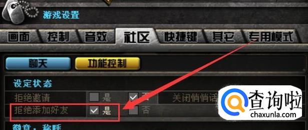 在功能控制页面即可看到拒绝添加好友,然后在图示位置将其设置成拒绝添加好友,如图所示。
