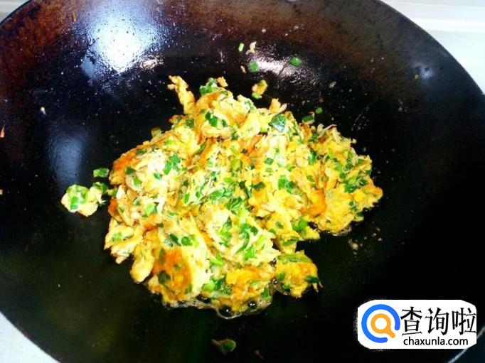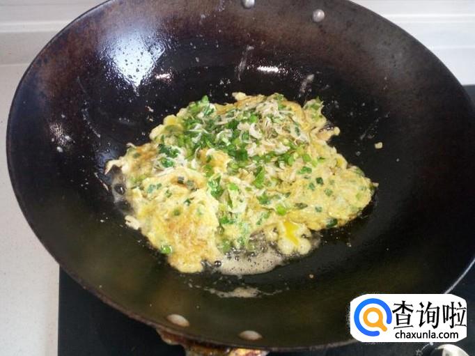 煎塌至韭菜虾皮鸡蛋液凝固后,用铲刀适当翻面,没有生鸡蛋液后,关火出勺。