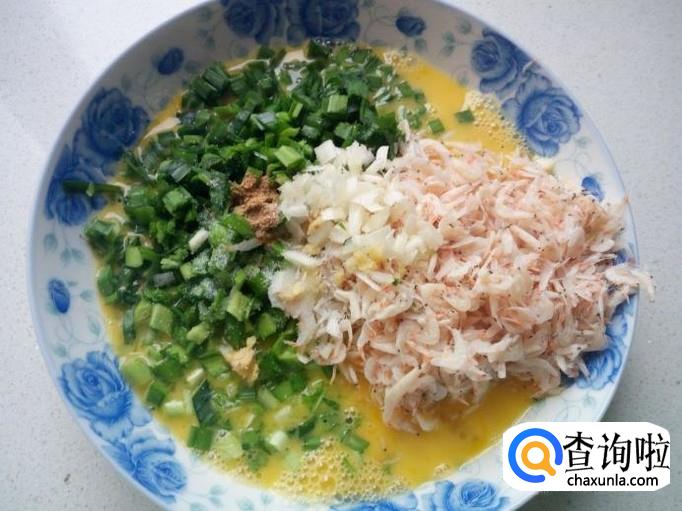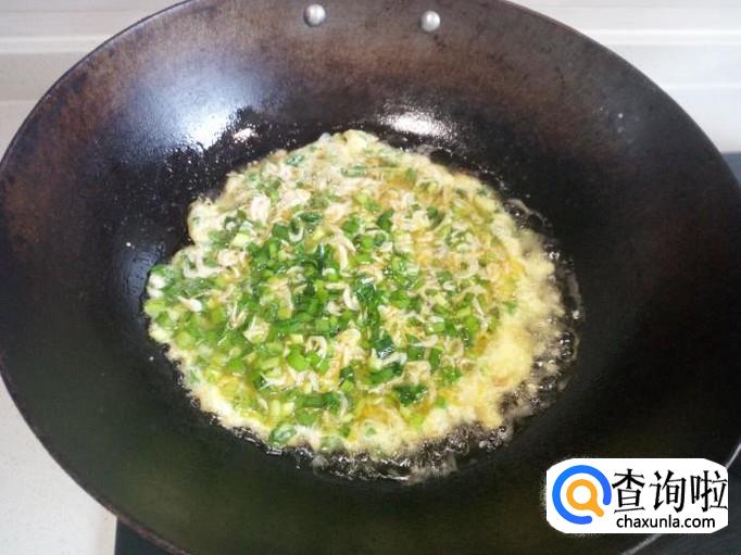 锅内放入油加热,油热后把拌和好的韭菜虾皮鸡蛋液,倒入锅中,中火煎塌。