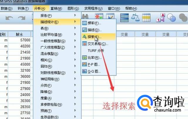 然后点击顶部的分析菜单,选择描述统计下面的探索选项,如下图所示