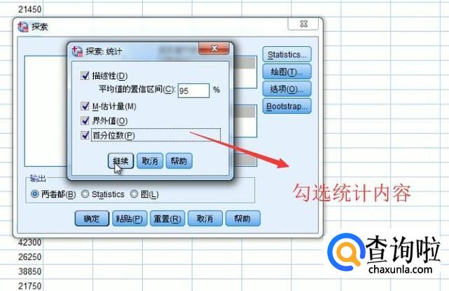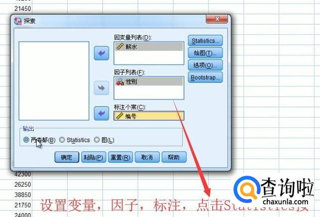 接下来在探索界面中设置变量,因子,标注,接着点击Statistics按钮,如下图所示