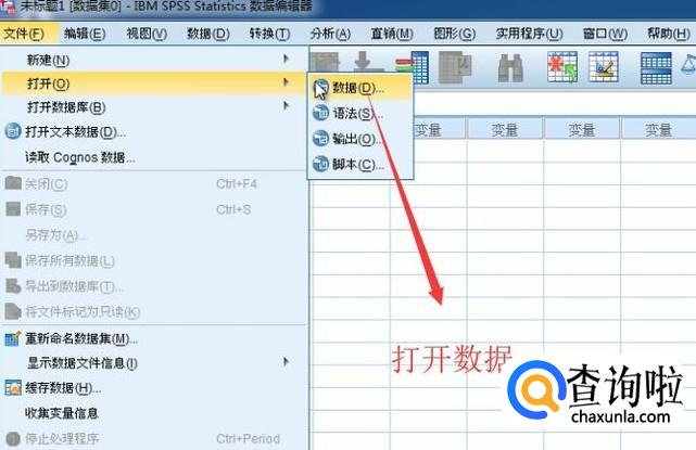 首先我们点击SPSS软件顶部的文件菜单,选择打开下面的数据选项,如下图所示