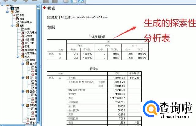 最后就会生成探索性分析的表格,左侧列表展示了生成的各种探索性图形,包括直方图,茎叶图,正态图等,如下图所示